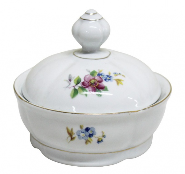 • PORCELANA- Açucareiro de porcelana branca com flores em policromia e acabamentos em filetes dourados. Da manufatura REAL S.PAULO MADE IN BRAZIL. Medidas 11,5A x  12D. Em bom estado.