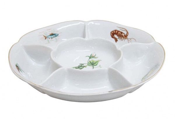 • PORCELANA-  Petisqueira em porcelana branca da manufatura SCHMIDT S. CATARINA MADE IN BRAZIL. Apresenta 5 divisórias laterais e uma central, com decoração de crustáceos e legumes, borda ondulada com acabamento de filete dourado. Medida 6A X 30D.
