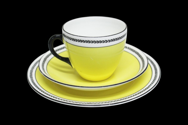 • PORCELANA-  Delicado trio para chá em porcelana branca , sendo xícara para chá (4,5A x 8D), pires (14D) e prato para bolo (17D),  pintado na cor amarela, com faixa branca e  guirlanda preta com  filetes prateados.  Manufatura SHELLEY CHINA - ENGALND. Em bom estado de conservação.