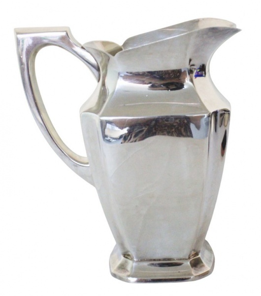 • METAL PRATEADO - Solida jarra em banho de prata da manufatura MERIDIONAL E.P.S. Mede 22 cm de altura. Em bom estado com marcas do tempo.