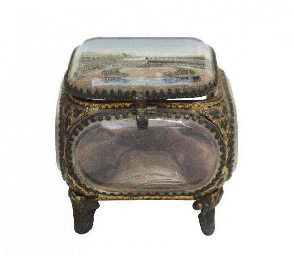 • CRISTAIS- Antiga e colecionável caixa em cristal europeu facetado com figura LE COLISÉE . Parte interna com tecido de seda vinho ( desgastado do tempo original ) em capitone, acabamento em metal dourado, base em quatro pés e fecho frontal de encaixe , típico das peças artesanais antigas. Medidas 7 X 7.