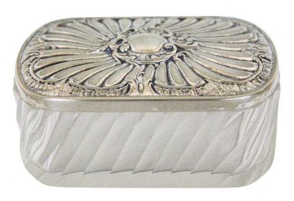 • CRISTAIS/VIDRO- Delicada caixa  Alemã em sólido cristal translúcido, tampa espessurado a prata com trabalho cinzelado. Medidas 5A x 12C x 8L. Em bom estado com mínimas marcas do tempo.