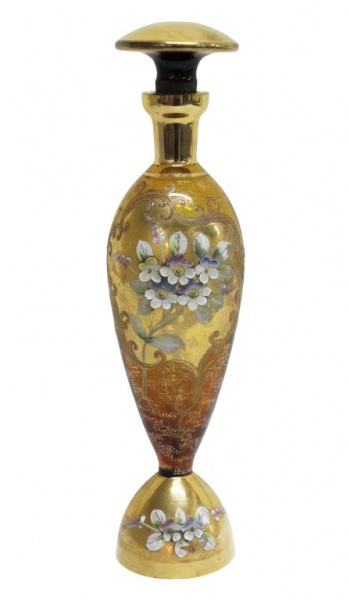 • CRISTAIS -  Antiga licoreira VENEZIANA na tonalidade âmbar, com farta douração e delicadas  flores em alto relevo pintadas a mão. Mede 31 cm de altura.