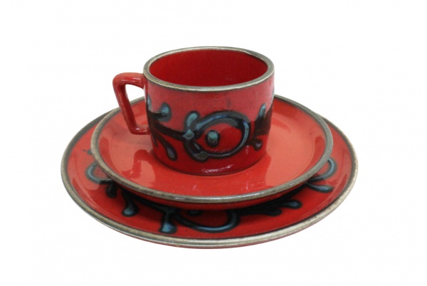 • PORCELANAS / CERÂMICAS - Trio para chá em louça ZELL AM HARMERSBACH (ALEMANHA OCIDENTAL). Com decoração em vermelho vitrificado e arabescos em policromia. Medidas: xícara 6A x 8D, pires 15D e prato para sobremesa com 19 cm de diâmetro. Em bom estado.