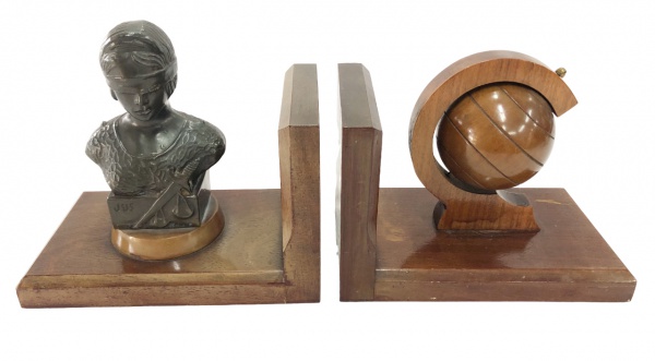 • Curioso e antigo serra livro em madeira nobre um com decoração de estátua da justiça em metal e outro com globo terrestre. Mede 13A x 20C x 12L. Em bom estado com mínimas marcas do tempo.