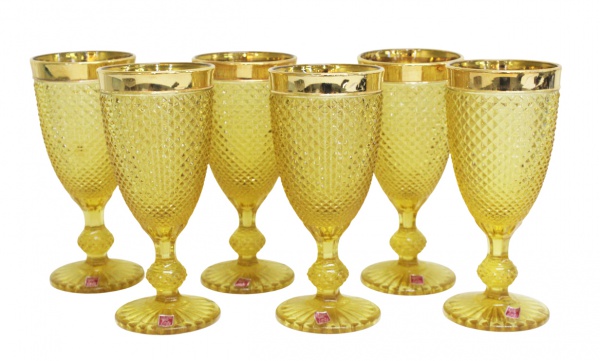 • CRISTAIS/VIDROS-  Conjunto de 6 taças para champanhe,  feita em peça única, em bico de jaca na tonalidade ambâr com borda dourada, da CRISTALERIA PRADO BRASIL conforme selo na peça. Medidas 16a x 7D. Em bom estado, com mínimas marcas do tempo.