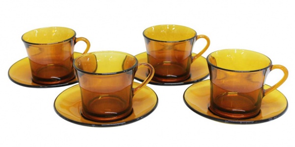 • VIDRO- Conjunto de 4 xícaras para chá em vidro temperado na tonalidade ambar, da manufatura DURALEX . A Duralex  é uma marca francesa, criada em 1945 pela SAINT-GOBAIN, especializada em vidro temperado. A Duralex chegou ao Brasil por importação nas décadas de 1960 e 1970, e a produção nacional a partir dos anos 1980 impulsionou sua popularidade por serem duráveis e resistentes a impacto. Medidas xícara 7A X 8D e pires 13,5D. Em bom estado de conservação.