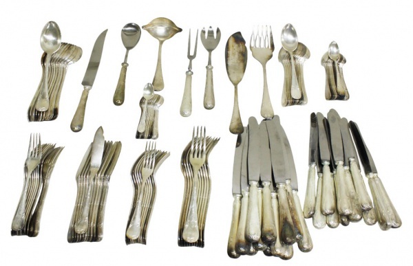 • FAQUEIROS - Antigo faqueiro em metal espessurado a prata, da manufatura FRACALANZA, com a famosa decoração de laçinho. Contém 127 peças, 12 facas, 12 garfos, 12 colheres para sopa, 12 garfos de sobremesa, 12 colheres de sobremesa, 12 facas de sobremesa, 12 garfos de peixe, 12 facas de peixe, 12 colherinhas de chá e 12 colherinhas de café. 7 talheres para serviço ( faltando concha, colher para arroz e colherinha de açucareiro). Banho de prata em bom estado, 8 facas de sobremesa com oxidações. Não possui caixa, acompanha porta talheres em feltro na tonalidade cinza da marca MIS TABLE.